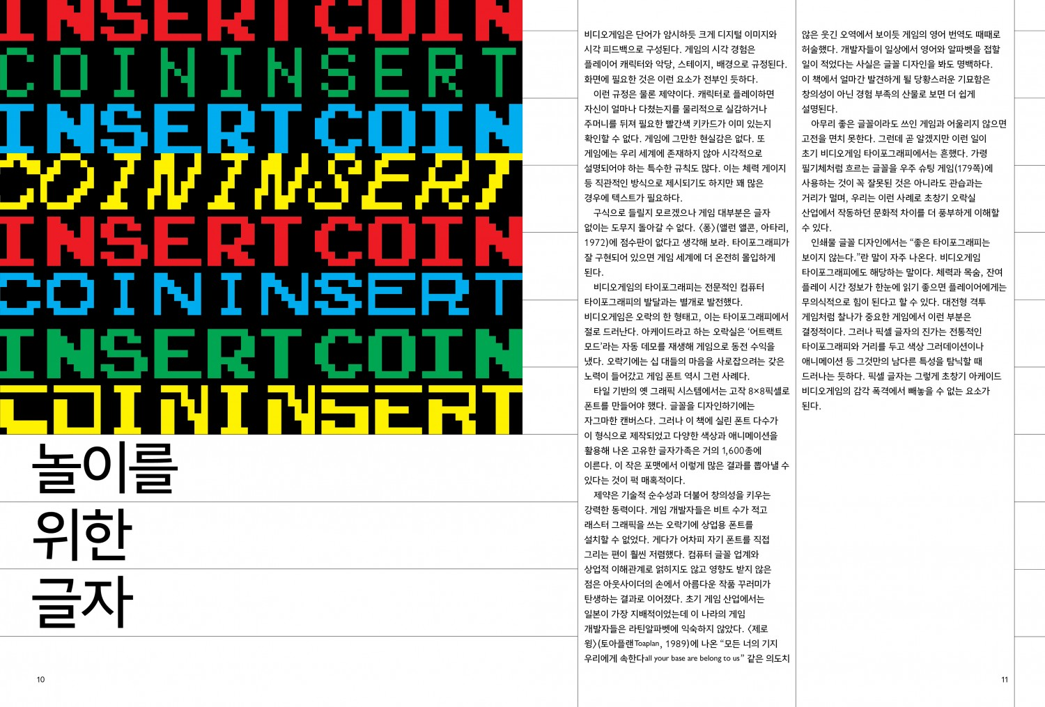 오마가리 토시는 독자가 어느 부분에 주목해야 할지 쉽고 재치 있게 안내합니다. 뛰어난 이야기꾼의 달변과도 같은 그의 해설에서는 아케이드에서 게임을 플레이하고 있는 듯한 소년의 설렘과 장난기까지 느껴지는데요. 『아케이드 게임 타이포그래피』 한국어판에는 타이포그래피와 아케이드 게임에 관한 「용어 해설」을 덧붙여 이 주제가 익숙하지 않은 독자도 부담 없이 접근할 수 있게 했습니다.