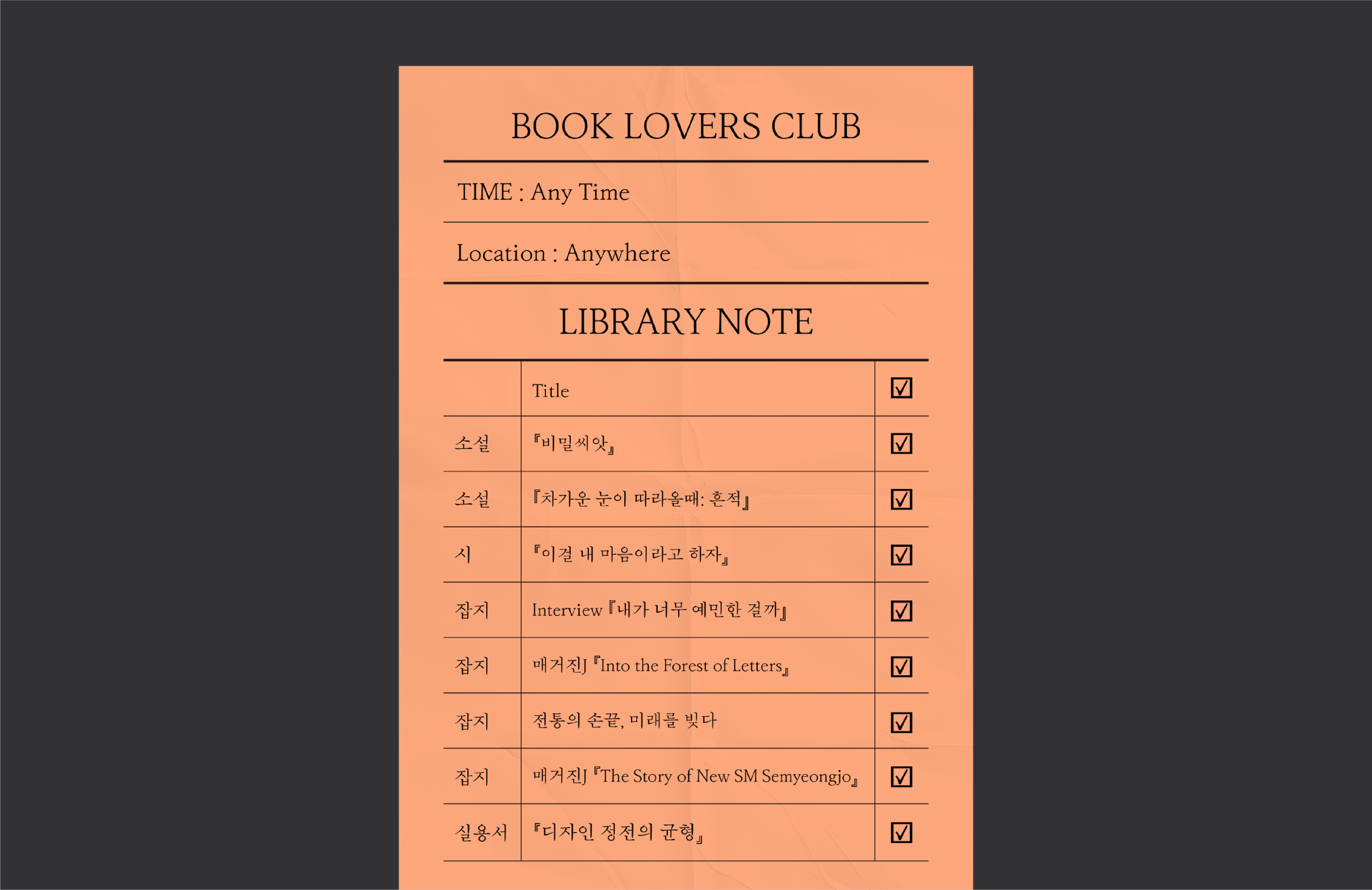 Font Note.New SM세명조의 간결한 획과 균형 잡힌 비례는여백이 많은 시집 페이지에서도 글자가 과하게 튀지 않고 자연스럽게 자리 잡습니다.